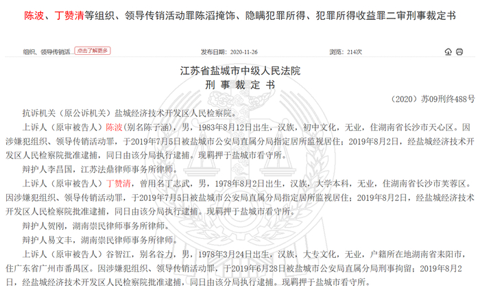 11月26日,根据中国裁判文书网,江苏省盐城市中级人民法院发布了对特大跨国网络传销犯罪案二审刑事裁定书,决定认为本案事实清楚,决定不开庭审理,驳回上诉,维持原判。