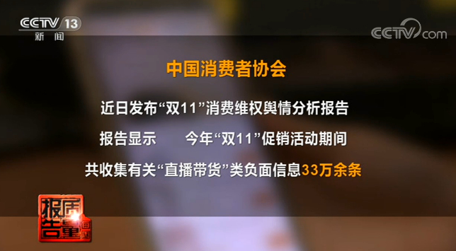 中国消费者协会近日发布“双11”消费维权舆情分析报告,报告显示,今年“双11”促销活动期间,共收集有关“直播带货”类负面信息33万余条。