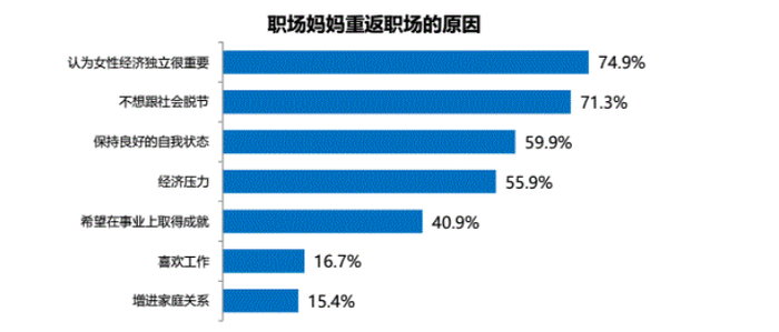 当女性被加上“妈妈”这个身份,有多少人会选择继续工作?妈妈们为何放不下这份事业?据《2019年职场妈妈生存状况调查报告》显示,“认为女性保持经济独立很重要”和“不想跟社会脱节”成为职场妈妈重返职场的重要原因,其次,“保持良好的自我状态”和迫于“经济压力”也是促使职场妈妈生育后返回职场的重要原因。
