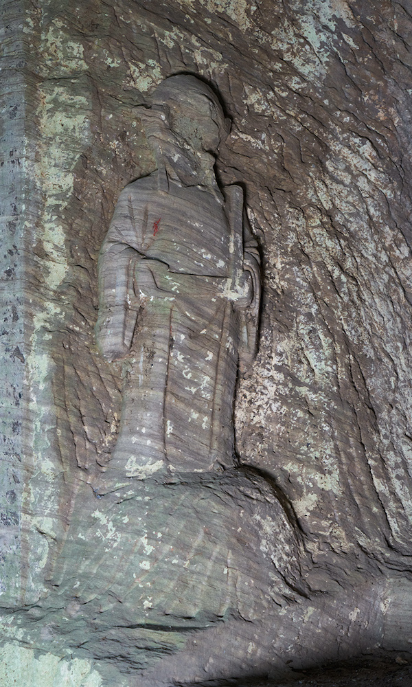此处石窟开凿于唐代,初为佛教造像。明代有计划的改建为道教造像,明人在原有唐代浅佛龛基础上加深窟龛刻像,曾凿掉该龛部分门楣新刻二侍者,斧凿痕迹现在仍清晰可见。