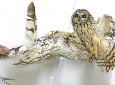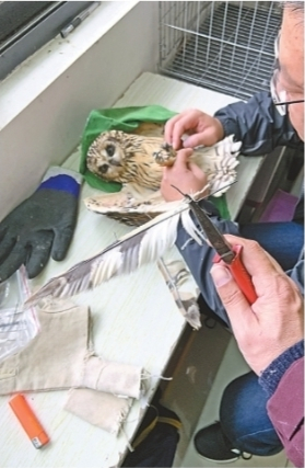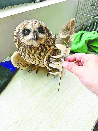 据介绍,接受羽毛修整术的鸟儿名叫“短耳鸮”,也叫夜猫子,是猫头鹰的一种,典型的夜行性动物,爱在草地活动,喜欢捕捉田鼠之类小动物,是活跃在我市郊区野地的一种常见冬候鸟。