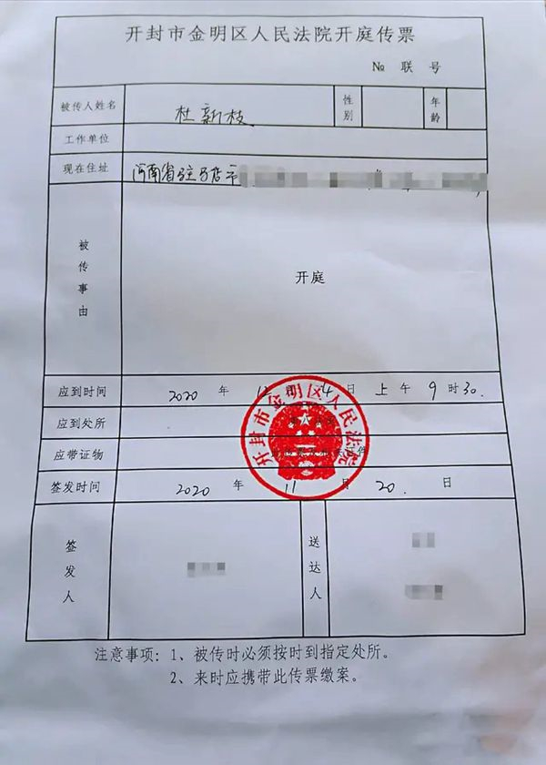 时隔数月,12月3日,《新民周刊》记者了解到,姚策委托生母杜新枝将开封卫健委告上法庭,要求公开1992年多份涉及疫苗接种及管理的相关文件。周兆成律师称,他已收到了《开封市金明区人民法院开庭传票》,法院决定在2020年12月4日上午9时30分,在第八法庭公开审理。