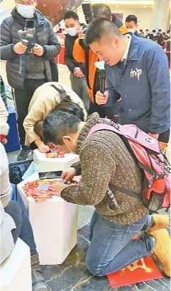 上午9点半,活动刚开始,商场内便来了不少在武汉晚报“长江健康”上认购的市民,大家通过扫码测温后进入活动现场,有序排队现场付尾款后领取自己的“新春大吉”刮刮乐,开启充满惊喜的刮奖之旅。