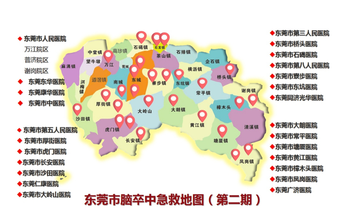2019年,第二期的“东莞市卒中急救地图”新纳入9家具备静脉溶栓能力医院,地图医院达到了26家,并对具备介入取栓能力的医院增加标注。同年7月,由东莞市脑卒中医疗质量控制中心(东莞市人民医院为牵头单位)为主要力量,全力推动全市卒中防治建设。