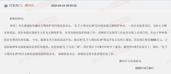 记者了解到,10年前,在洛阳市的政协会议上,就有政协委员多次提交关于加强包括孔子入周问礼碑在内多个现存文化遗址保护的提案。而在网络中,记者搜索发现,有网友多次通过“地方领导留言版”等渠道提交过相关建议,并得到了包括洛阳市“110联动办公室”、瀍河回族区科技文化旅游局等单位以“加强保护”为主要回复内容的答复。