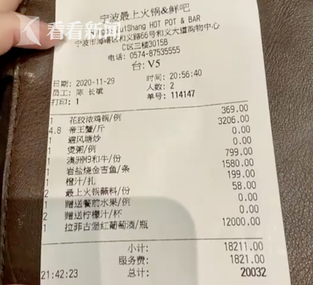 报道中,女子说那家火锅店是宁波最贵的,光装修就花了一个亿,还说店里有价值二十万的红酒——罗曼尼康帝。新闻播出后,网友直呼这家店黑心。