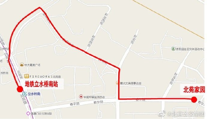 中途设站:北苑家园、北苑家园西站、锦芳路、锦芳北街、立通路南站(开往地铁立水桥南站方向)、地铁立水桥南站。
