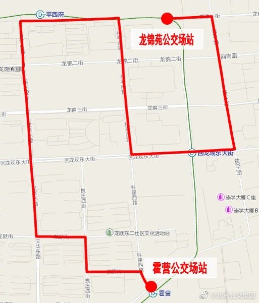 中途设站:龙锦苑公交场站、霍营北口、霍营、上坡佳园西门、地铁回龙观东大街站、和谐家园、和谐家园二区西门、和谐家园一区西门、科星西路北口(开往霍营公交场站方向)、地铁平西府站(开往龙锦苑公交场站方向)、文华东路、良庄家园、龙跃苑二区、龙跃苑一区西门、龙跃苑一区南门、龙跃苑三区东门、霍营公交场站。