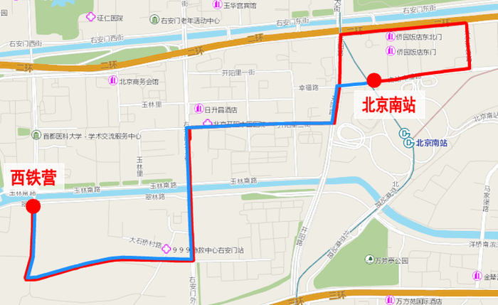 中途设站:西铁营、中顶村、福宜街、福宜街东口、翠林小区、右安门外、开阳里西、开阳里东、开阳桥南、开阳桥东(开往北京南站方向)、陶然亭公园南门(开往北京南站方向)、北京南站。