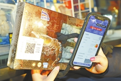 15:22,记者用自己的手机扫码其中一盒泰国活冻黑虎虾的“鄂冷链”码,产品信息很快跳出来——