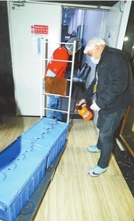 14:40,冷冻仓工作人员用季铵盐消毒液,对虾的外包装进行消毒;