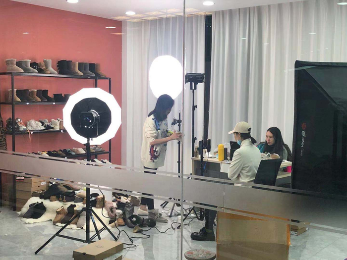 不少单间里堆满了颜色、风格不同的各式雪地靴,主播们或坐或站在手机屏幕前,拿着当季热门款式对着镜头详细地讲解着鞋子的材质和价格,就粉丝提出的问题进行解答,并不时穿在脚上展示搭配效果。旁边的助理则不时为其递上下一款雪地靴进行直播介绍。