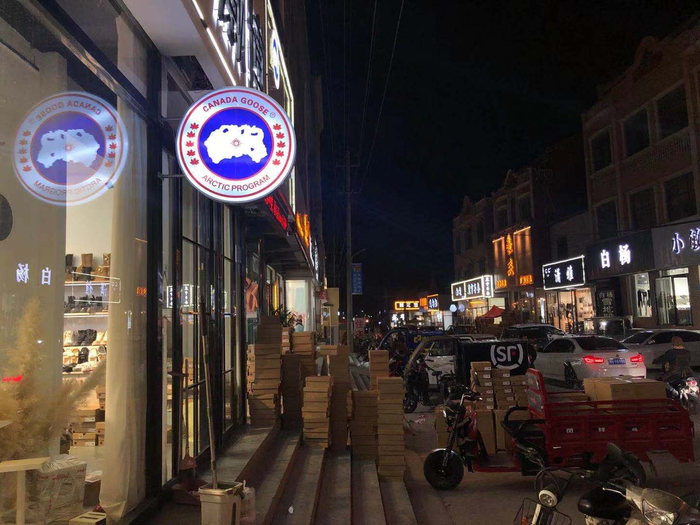 记者注意到,各家档口除了雪地靴外,还挂着大鹅(CANADA GOOSE)、北面(The North Face)等品牌的羽绒服,以及印有Gucci、Fendi等logo的羊毛围巾。当记者以“本地不产鹅绒,为何会有这么多羽绒服”向一家档口老板咨询时,老板表示,这些羽绒服大多来自广东和福建,是当地工厂看中桑坡村的人气,特意过来开店销售,甚至不少工厂还计划在当地开厂,代购在选择雪地靴进货时,也就能一并将配套冬季商品买了。