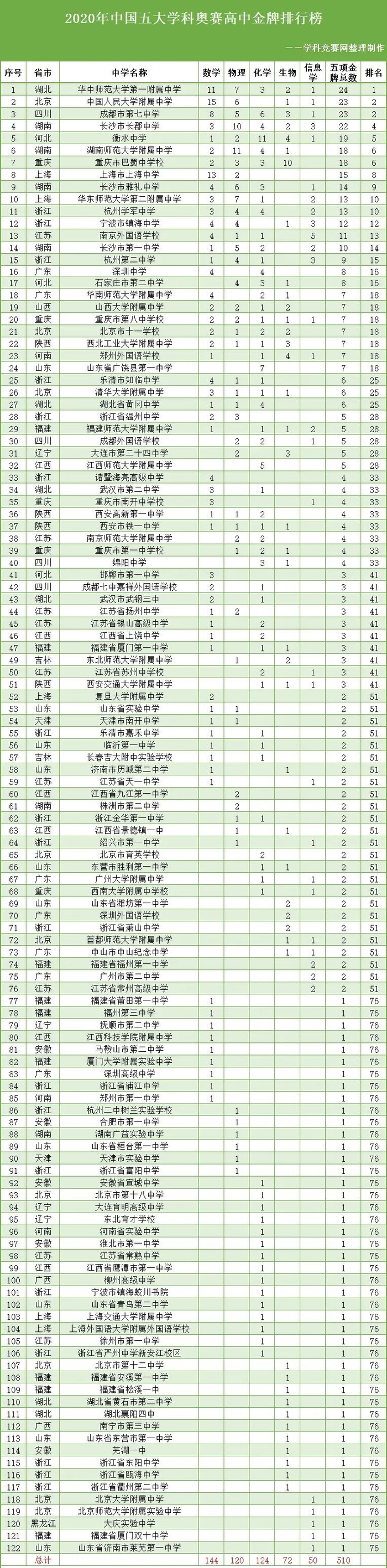 3.2020年全国五大学科奥赛高中金牌排行榜