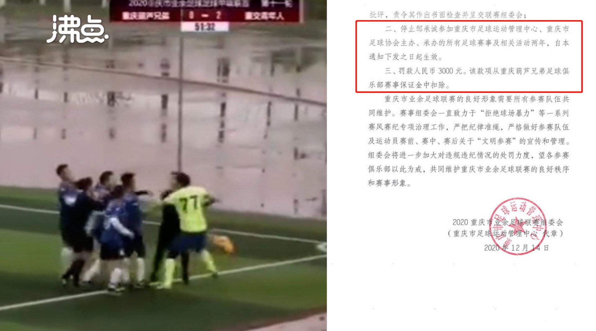 原标题:重庆足协回应球员恶意踢人:球员被禁赛两年 罚款3000元