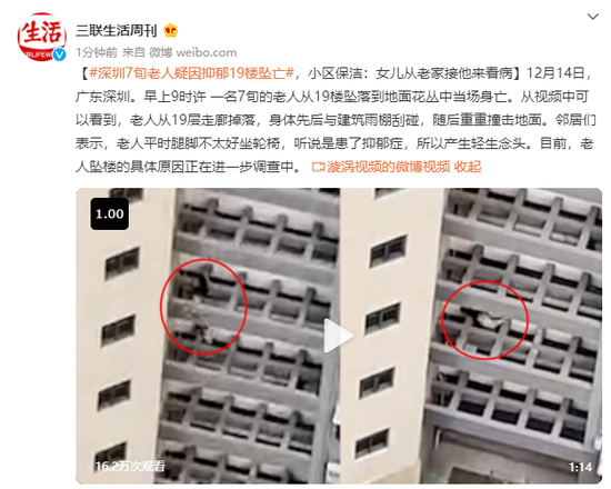 深圳7旬老人因抑郁19楼坠亡?小区保洁:女儿从老家接他来看病