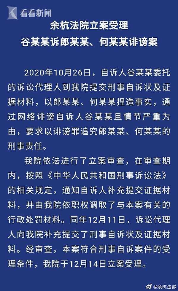 据杭州市余杭区人民法院官方公众号12月14日消息,10月26日,自诉人谷某某委托的诉讼代理人到我院提交刑事自诉状及证据材料,以郎某某、何某某捏造事实,通过网络诽谤自诉人谷某某且情节严重为由,要求以诽谤罪追究郎某某、何某某的刑事责任。