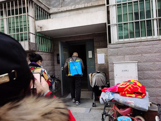 12月11日下午2时,记者再次来到小区,10名物业工作人员正在做清理前的准备工作。物业保洁负责人和老人协商好清理范围:仅对废品堆放最严重的客厅、餐厅进行清理,不会进出老人家中其他区域。一名工作人员开着电动三轮车运来近50个大编织袋,另一名工作人员背上大桶驱虫剂,手持喷头,对楼道进行消杀。“提前在楼道里喷上药,一会清理过程中就不怕从屋子里跑出的蟑螂爬到邻居家里去。”工作人员解释说。