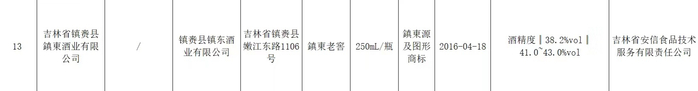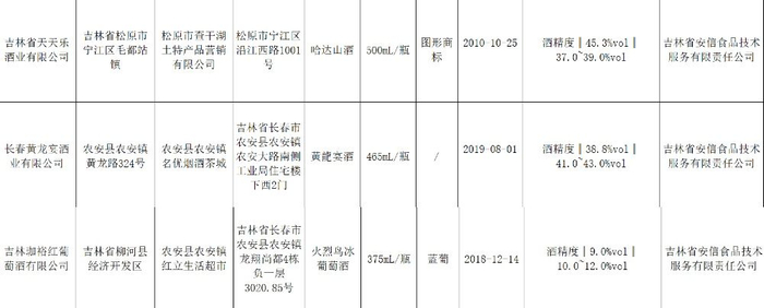 具体来看,4批次酒精度不合格酒类产品分别是:镇赉县镇东酒业有限公司销售的标称吉林省镇赉县鎮東酒业有限公司生产的鎮東老窖(250mL/瓶、鎮東源及图形商标),松原市查干湖土特产品营销有限公司销售的标称吉林省天天乐酒业有限公司生产的哈达山酒(500mL/瓶、图形商标),农安县农安镇名优烟酒茶城销售的标称长春黄龙宴酒业有限公司生产的黄龍宴酒(465mL/瓶)和农安县农安镇红立生活超市销售的标称吉林珈裕红葡萄酒有限公司生产的火烈鸟冰葡萄酒(375mL/瓶、蓝葡商标)。检验机构皆为吉林省安信食品技术服务有限责任公司。