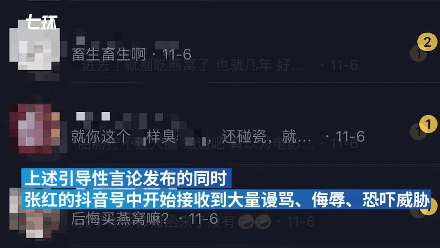 辛有志发布引导性言论发布的同时,张红的抖音号中开始接收到大量谩骂、侮辱、恐吓威胁,“打电话骚扰我,还有说全家死,还有说出门撞死 开车撞死我,给我家送花圈,死全家等等。”