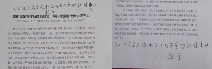 “我们这几天去了很多地方,但从12月6日到现在,已经过去10天了,还是没有任何人或者任何单位给我们一个明确的说法。”张厅表示,自己的父亲只是一个老实巴交的农民,“他生前身强力壮,未被羁押之前还经常帮人干繁重的体力活,不存在任何足以致死的大病,但在被抓后,却突然就走了,我想要一个说法。”