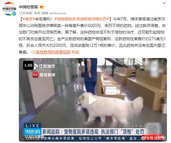 今年7月,媒体曾报道过南京河西中心动物医院涉嫌贩卖一种每毫升售价6000元、来历不明的药物。经过数月调查,执法部门对其开出顶格罚单。据了解,这种药物非但不利于宠物的治疗,还可能引起宠物的不良反应甚至死亡。生产此款药物的美国产商回复称,这款药物在美售价约275美元1瓶,折合人民币大约2000元,远低该医院12万1瓶的售价,且此药物并没有在国内登记备案。