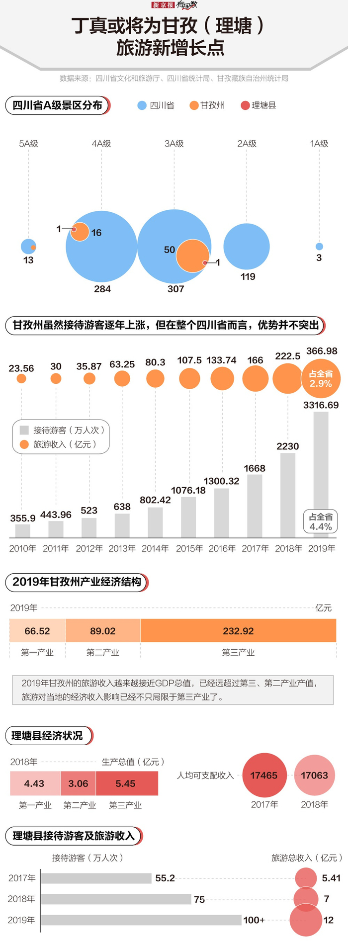 事实上,在此次丁真大火之前,甘孜州也是有名的旅游目的地。从甘孜州统计局公布的数据看,近几年接待游客数量与旅游输入不断增长,2019年甘孜全年接待游客3316.69万人次,实现旅游收入366.98亿元。但受制于资源的短缺和基础设施制约,按照2019年四川省旅游总人数和收入计算,甘孜州旅游优势并不突出。