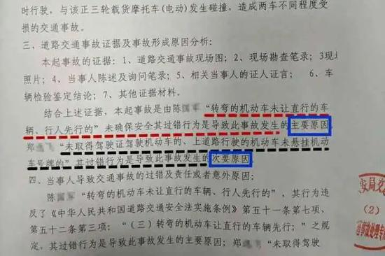 在这份交警部门开具的认定书上明确说明,劳斯莱斯车主陈先生未在确保安全的情况下转弯且没有避让直行车辆,是导致此次事故发生的主要原因。而正三轮摩托车(电动)车主郑先生未取得相应车辆的驾驶证、上道路的机动车未悬挂机动车号牌,是导致此次事故的次要原因。