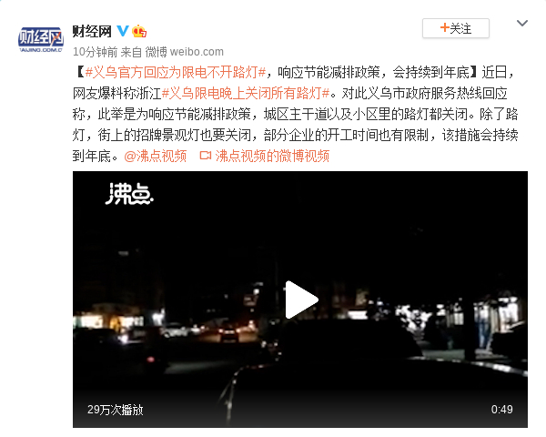 义乌官方回应为限电不开路灯:响应节能减排政策 会持续到年底