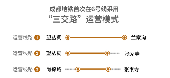 6号线采用早间首班车多点发车、末班车分段收车的方式,早间分别为每日06:10在上行兰家沟、松林、杭州路、麓山大道、新川路、金融城东、牛王庙、前锋路以及下行望丛祠、檬梓、犀浦、侯家桥、金府、人民北路站开行相应方向首班车。望丛祠末班车分为两个方向,至兰家沟方向的列车发车时间为22:30,至张家寺方向的列车发车时间为23:00,兰家沟末班车时间为22:30。