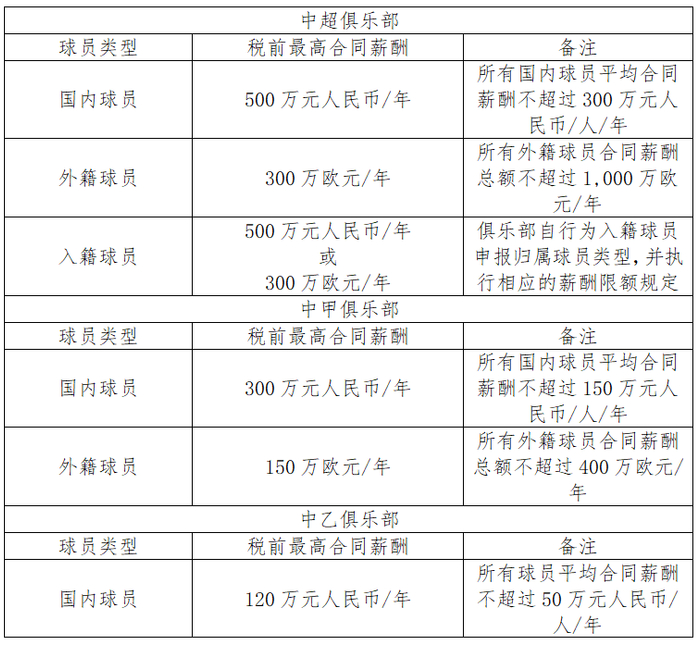 (十七)优化俱乐部的运营模式,控制中超俱乐部资金投入,适当降低球员薪酬水平。从2021年起,中超俱乐部运营费用年支出不得超过6亿元人民币,中甲俱乐部不得超出2亿元人民币,中乙俱乐部不得超出5,000万元人民币。俱乐部一线队球员合同薪酬限额如下: