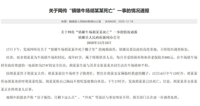 据云南镇雄县人民政府网站消息,镇雄县人民政府新闻办公室18日发布关于网传“镇雄牛场胡某某死亡”一事的情况通报。通报称,17日下午,发现网络有关于“镇雄牛场胡某某冷死于棚子里”的视频流传,镇雄县委县政府高度重视,立即组织调查核实。