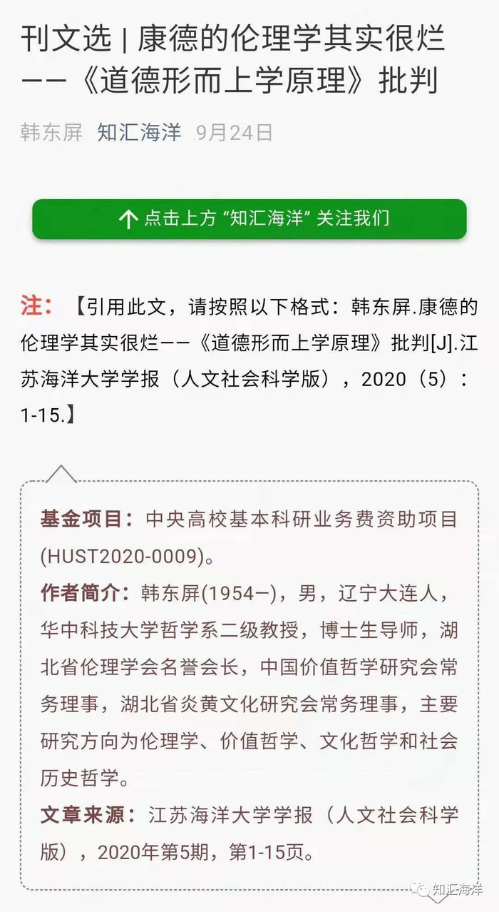 澎湃新闻记者从《江苏海洋大学学报(人文社会科学版)》方面获悉,该学报12月19日通过旗下微信公众号发布了《<康德的伦理学其实很烂>作者声明暨编辑部征集商榷稿件启事》:《江苏海洋大学学报(人文社会科学版)》2020年第5期刊发了华中科技大学哲学系韩东屏教授撰写的《康德的伦理学其实很烂——〈道德形而上学原理〉批判》一文,文章刊发后,在学界引起了强烈反响,在网络空间出现了批判、批评、赞许等争论不休的情况。为此,文章作者通过《江苏海洋大学学报》所属的公众号发布声明,相关期刊发布征集商榷稿件启事,为争鸣提供便利。