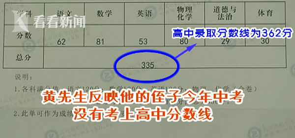 黄先生介绍,自己的侄子去年父亲去世,今年参加中考,总成绩仅仅335分,没有达到东西湖区当年362分的高中录取分数线,没有办法读普通高中。但是孩子又想上高中,于是家里到处找人,最终武汉为明学校高中部发来了录取通知书。
