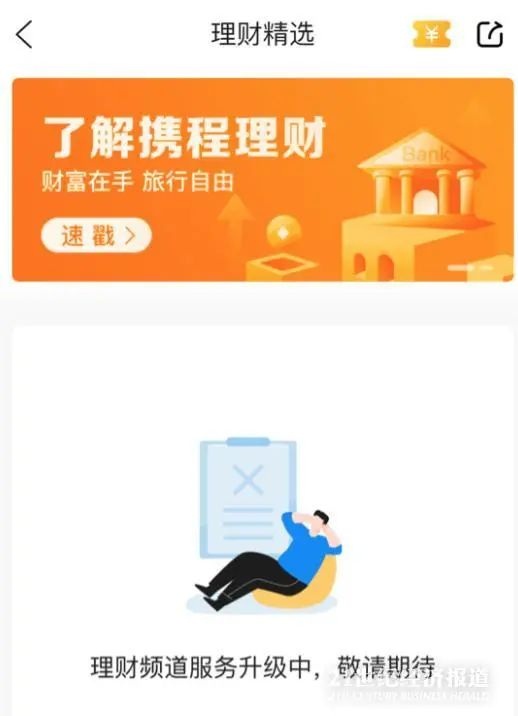 此外,携程金融APP也显示,其理财频道服务升级中。据其介绍显示,携程金融-银行直供服务平台精选高收益、多期限的存款产品,所有交易操作及资金流程均在银行端完成,银行直销,安全放心。