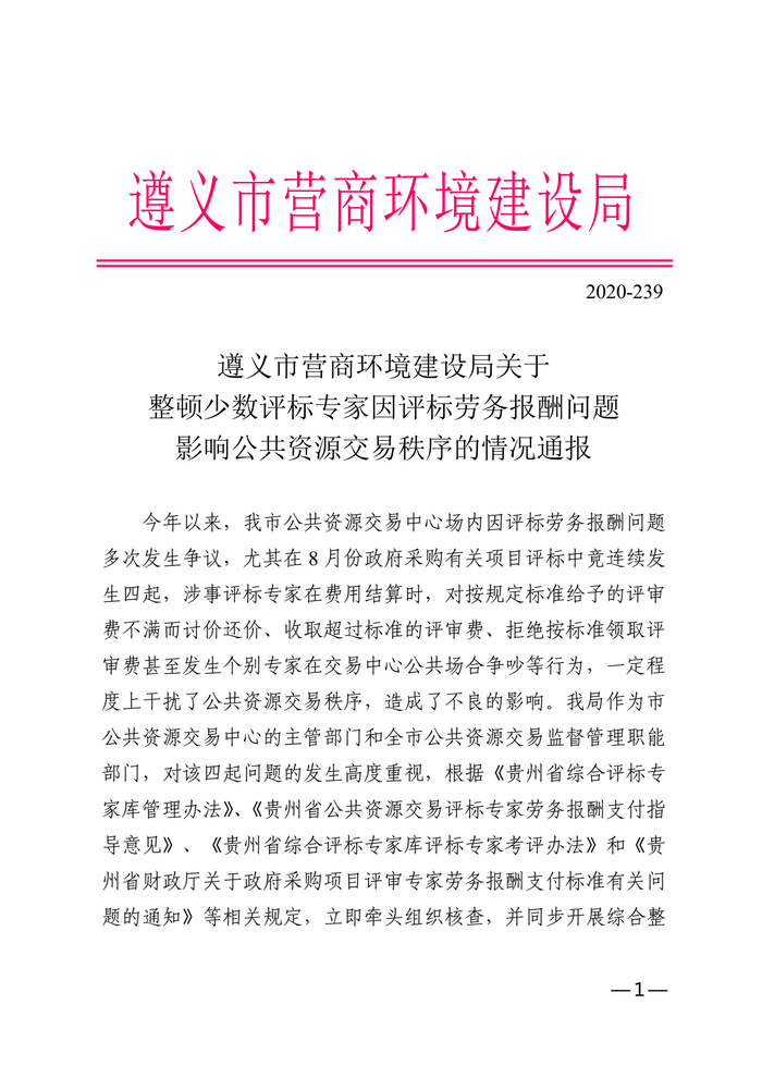 据贵州遵义市公共资源交易中心网站12月21日消息,遵义市营商环境建设局17日已发出《关于整顿少数评标专家因评标劳务报酬问题影响公共资源交易秩序的情况通报》称,今年以来,遵义市公共资源交易中心场内因评标劳务报酬问题多次发生争议,尤其在8月份政府采购有关项目评标中竞连续发生四起,涉事评标专家在费用结算时,对按规定标准给予的评审费不满而讨价还价、收取超过标准的评审费、拒绝按标准领取评审费甚至发生个别专家在交易中心公共场合争吵等行为,一定程度上干扰了公共资源交易秩序,造成了不良的影响。