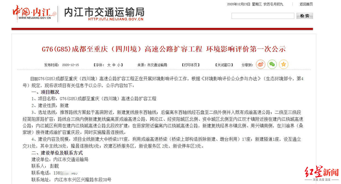 最近,成渝高速四川段扩容再有新进展。12月23日,红星新闻记者从项目建设单位内江市交通运输局获悉,目前该项目正在进行第一次环评公示。根据公示,项目性质为新建,推荐线路方案为成都二绕至三绕段并入既有成渝高速原路扩容外,其余为新建复线。