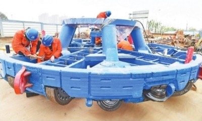 23日,记者在现场见到,巨大的盾构机刀盘已经运输到工地上,工人正在进行组装。彭红胜介绍,接下来双向盾构均将开始始发准备,汤云海站-马池站区间单线长达4.92公里,是全线最长的盾构区间,设2座中间风井,9个联络通道,其中2个与风井合建,1个与泵房合建。