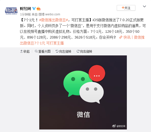 原标题:7个1元 !微信推出微信豆,可打赏主播