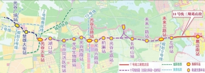 11号线三期葛店段工程,西起于东段一期工程终点站左岭站,沿高新大道路北侧向东前行,下穿短咀里湖后,继续沿高新大道路北侧前行,下穿发展大道后,由路侧转入高新大道路中,在与曹岭路交汇处设终点站葛店南站。