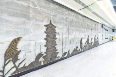 走进车站,就立刻被站厅层两侧的6幅艺术墙给吸引目光,该车站以“鄂楚文苑”为设计主题,车站造型上的穿插组合、空间序列的展开、元素的连续和重复,强调艺术空间化的一体关系,通过纵向灯光的变化营造出连接现在通向未来的“时光隧道”,带动葛店开发区的经济和科技以“光的速度”发展腾飞,希望打造一条具有希望、科技、人性化的标杆地铁。