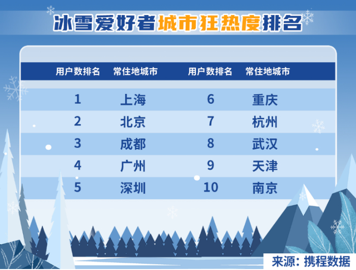 “得不到的永远在骚动,被偏爱的有恃无恐”这句耳熟能详的歌词,如今也可以用在滑雪上。携程数据显示,除了北京和天津,排名前十的冰雪爱好者常住地城市分别为上海、成都、广州、深圳等南方城市。