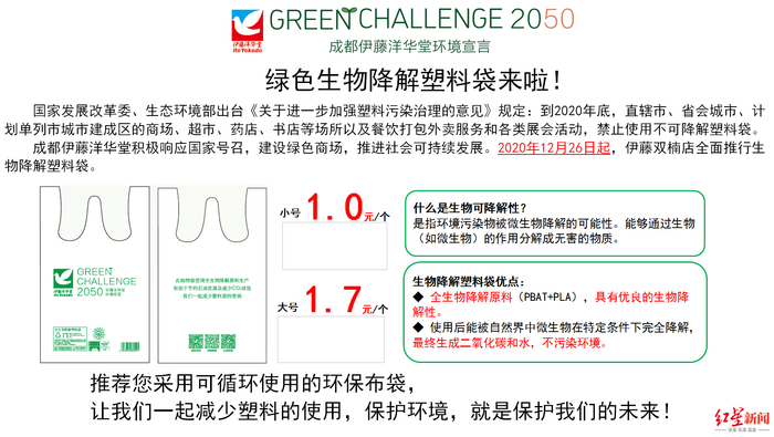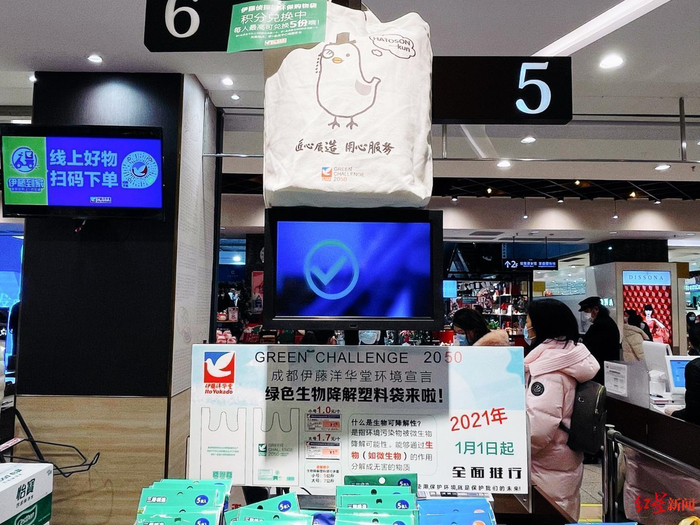记者实地来到成都伊藤洋华堂双楠店发现,目前超市收银台处已经放置了醒目的“绿色生物降解袋来了”的告示,上面详细介绍了“生物降解”及其优点,并对该全生物降解塑料袋进行了展示。同时,伊藤在收银处还展示了印有吉祥物的环保袋,会员以小额积分就可以进行免费兑换。
