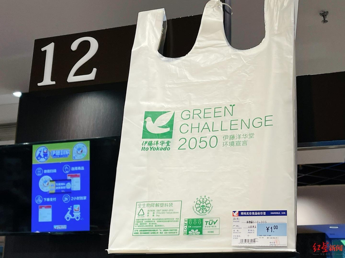 伊藤目前在售的全生物降解塑料袋分为两个型号,中号售价1元、大号1.7元。对于伊藤为什么选择此类成本较高的全生物可降解塑料袋,记者采访到成都伊藤洋华堂SDGs(可持续发展目标)项目相关负责人,该负责人告诉记者,可降解是个大概念,生物降解是指物料在自然环境通过微生物及特定条件完全降解,最终以二氧化碳和水的形态进入自然界,对自然环境不产生负担。