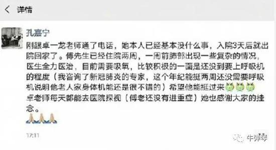 按照傅聪的学生、英国皇家音乐学院中国籍教授孔嘉宁在社交平台里的介绍:傅聪夫人卓一龙教授,入院三天后就出院了,但傅聪入院两周,需要吸氧,但还没到上呼吸机的程度,说明已经86岁高龄的傅聪先生身体机能很不错……