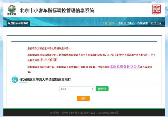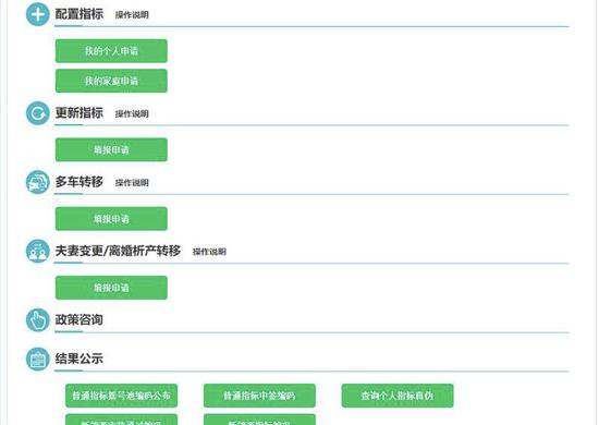 打开北京市小客车指标调控管理信息系统网站,登录账号后,除了最顶部的账号信息,页面多了6个栏目,包括配置指标(我的个人申请、我的家庭申请)、更新指标、多车转移、夫妻变更/离婚析产转移、政策咨询及结果公示。