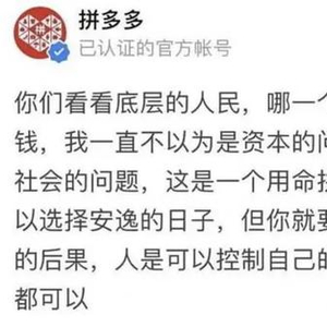 事情缘起1月4日,名为“拼多多”的知乎账户就近日网传的“拼多多23岁女员工深夜下班后猝死”一事的相关知乎问答,发表回答称,“你们看看底层的人民,哪一个不是用命换钱,我一直不以为是资本的问题,而是这个社会的问题,这是一个用命拼的时代,你可以选择安逸的日子,但你就要选择安逸带来的后果,人是可以控制自己的努力的,我们都可以”。