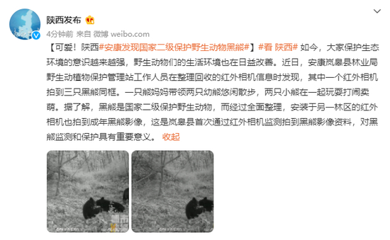 原标题:可爱!陕西安康发现国家二级保护野生动物黑熊