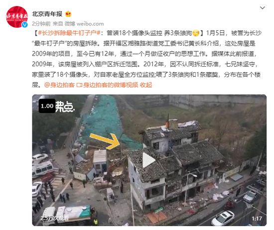 原标题:湖南长沙拆除最牛钉子户:曾装18个摄像头监控 养3条狼狗