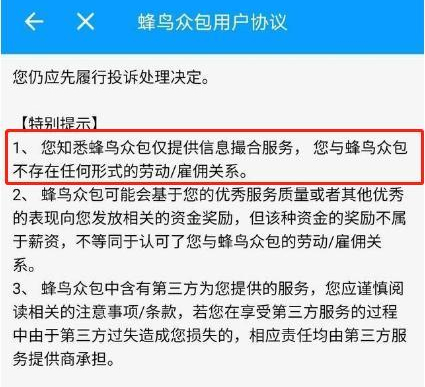 2000元的“人道主义补偿”,合理吗?平台方之所以有底气这样做,是因为双方并不存在劳动关系。据红星新闻报道,在注册成为饿了么骑手前,用户须阅读3个相关的协议和承诺书。其中,在《蜂鸟众包用户协议》书里,有一项特别提示,明确表示蜂鸟众包仅提供信息撮合服务,用户与蜂鸟众包不存在任何形式的劳动/雇佣关系。